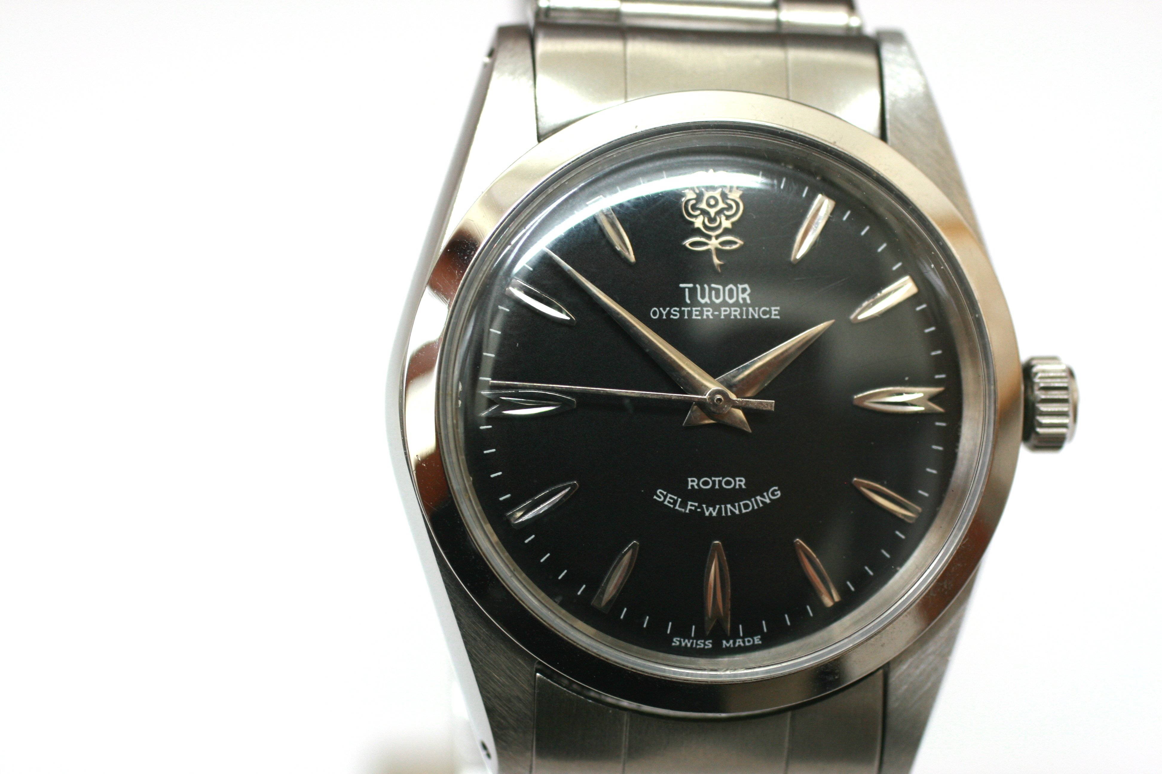 竜頭はロレックスのクラウンロゴ入り、裏蓋には「ORIGINAL OYSTER CASE BY ROLEX GENEVA」 ベルト飛出し王冠!