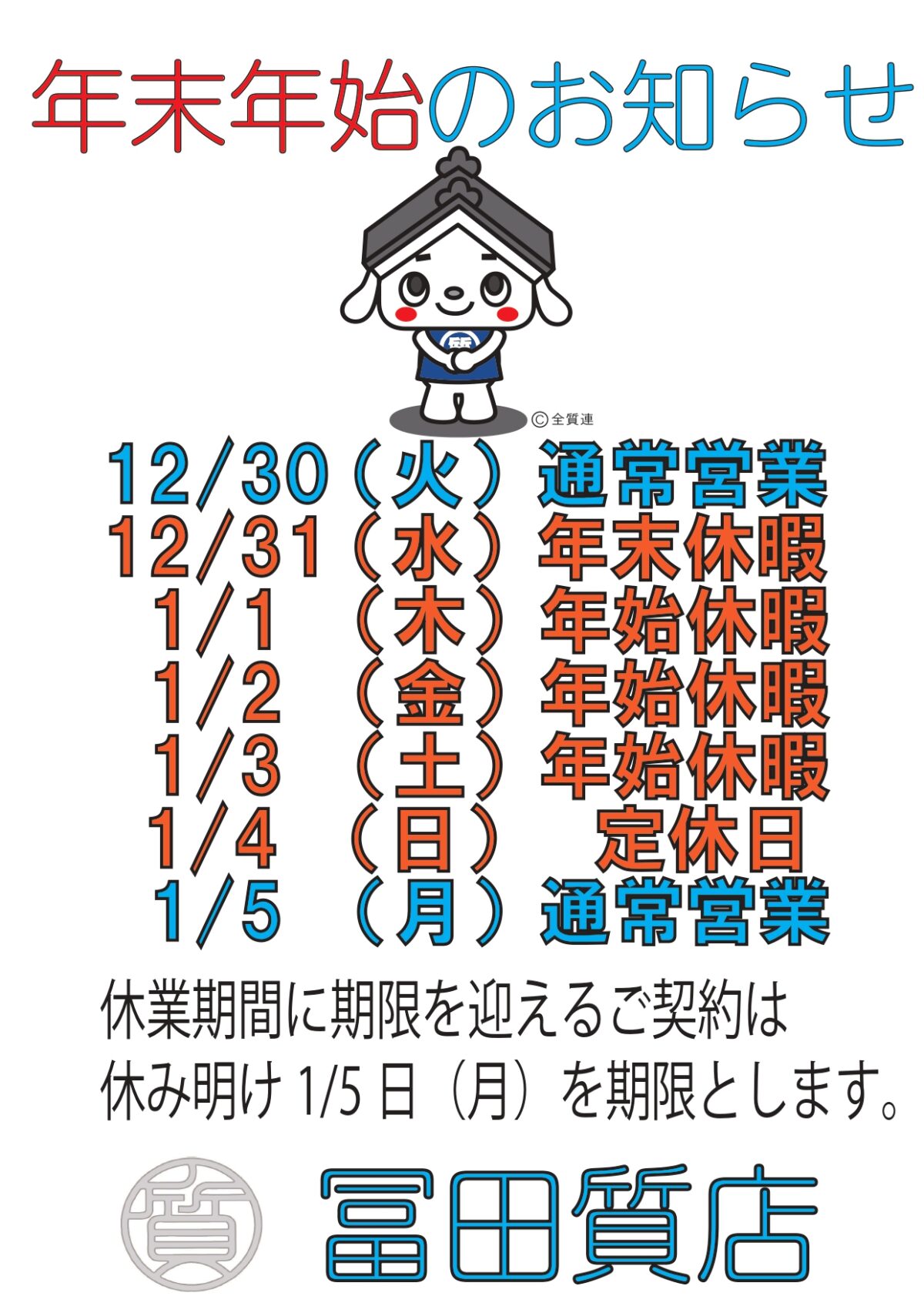 カテゴリー blog お知らせ 冨田質店からのお知らせ 最新買取情報 年末年始についてのお知らせ 投稿者 作成者: 78tomitaadmin 投稿日 2025年12月17日 いつも冨田質店をご利用頂きありがとうございます。 年末年始の営業は画像の通りになります。 また、質預かりで休業期間に期限を迎えるものは休み明けの1/5㈪を期限とします。 今後とも、冨田質店をよろしくお願いいたします。 ← 18金製品まとめ買い