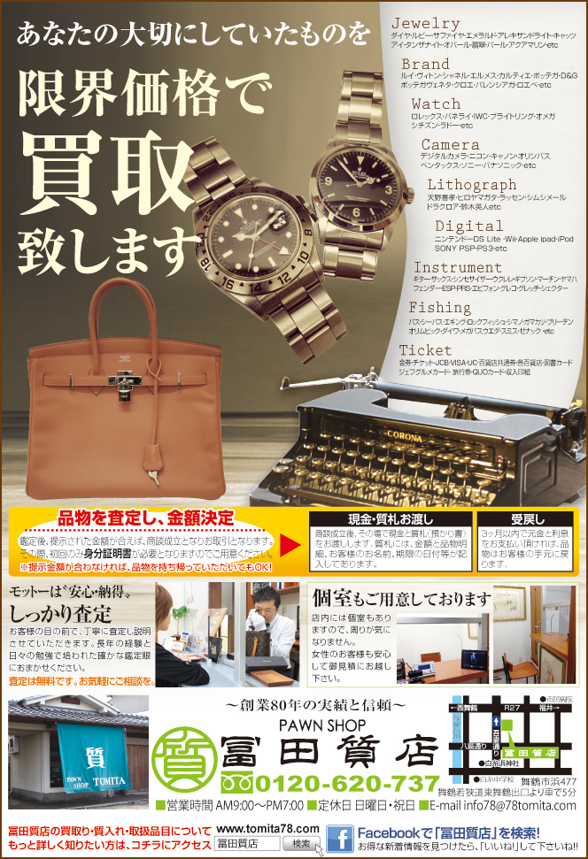 今回の広告も何度もやり直して出来上がったデザインですが先日「カッコイイ広告ですね」褒めて頂いて、非常に嬉しかったのですが限られた枠の中です全てを伝える事は難しく、逆に自分が見た場合一緒に掲載されているお店の広告を隅から隅まで読んでいる訳でもないので・・・・やはりカッコイイだけでは駄目かな~と次のアプローチを考えてます、質屋って買取もやってるんや~みたない時代です、伝統的な質屋のシステムも知ってもらいつつ気軽に商品をお売り頂けるような展開をしていきたいと思います。