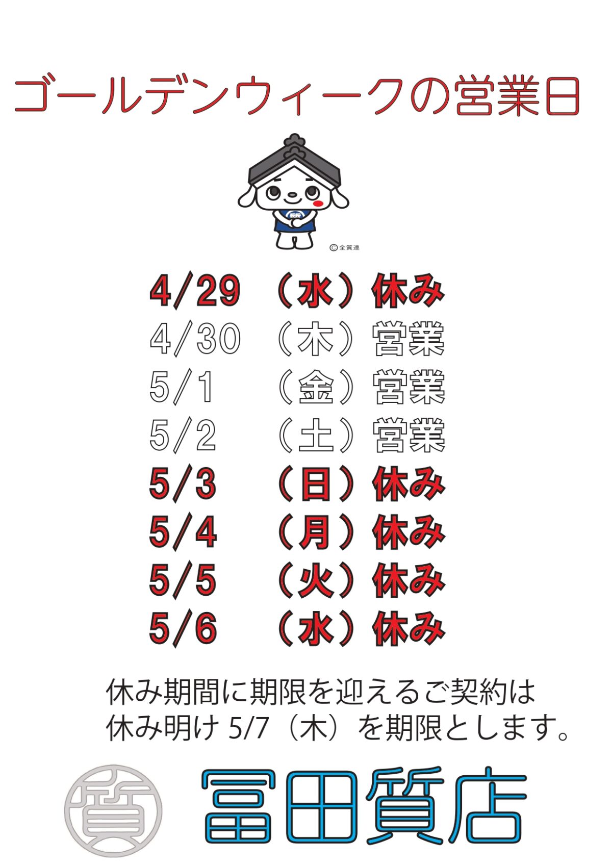 また、店休日中に期限を迎える質預かりは休み明けの5/7㈭扱いとします。